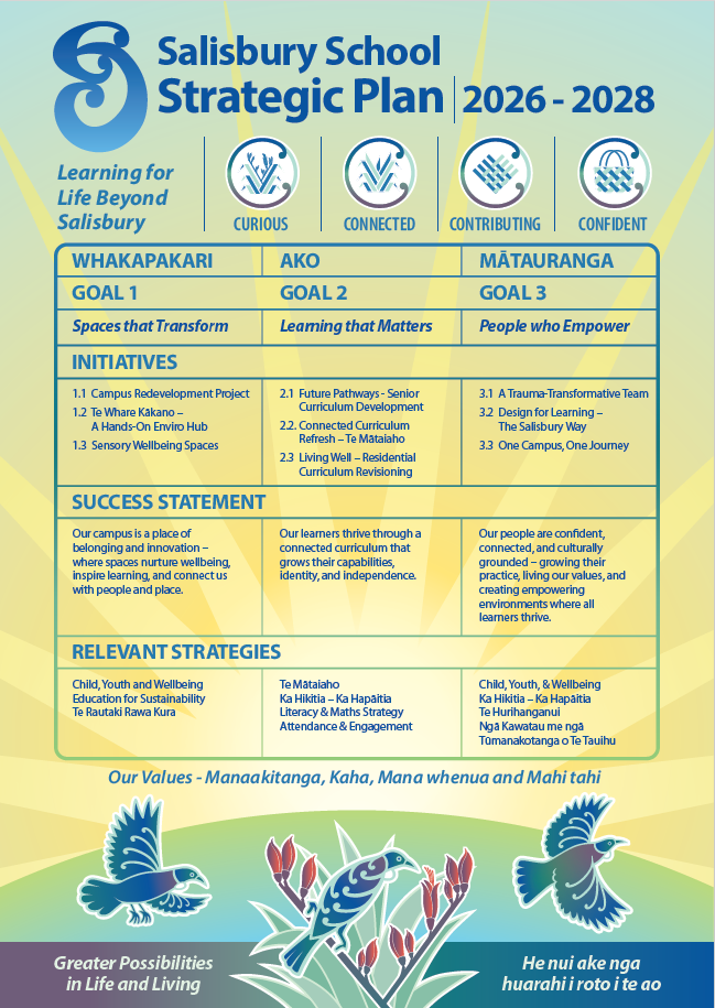 It captures what matters most and sets a clear, values-driven direction for our future. This living document is our guiding compass, supporting our strategic mahi as we continue to strive for excellence in all that we do at Salisbury School.